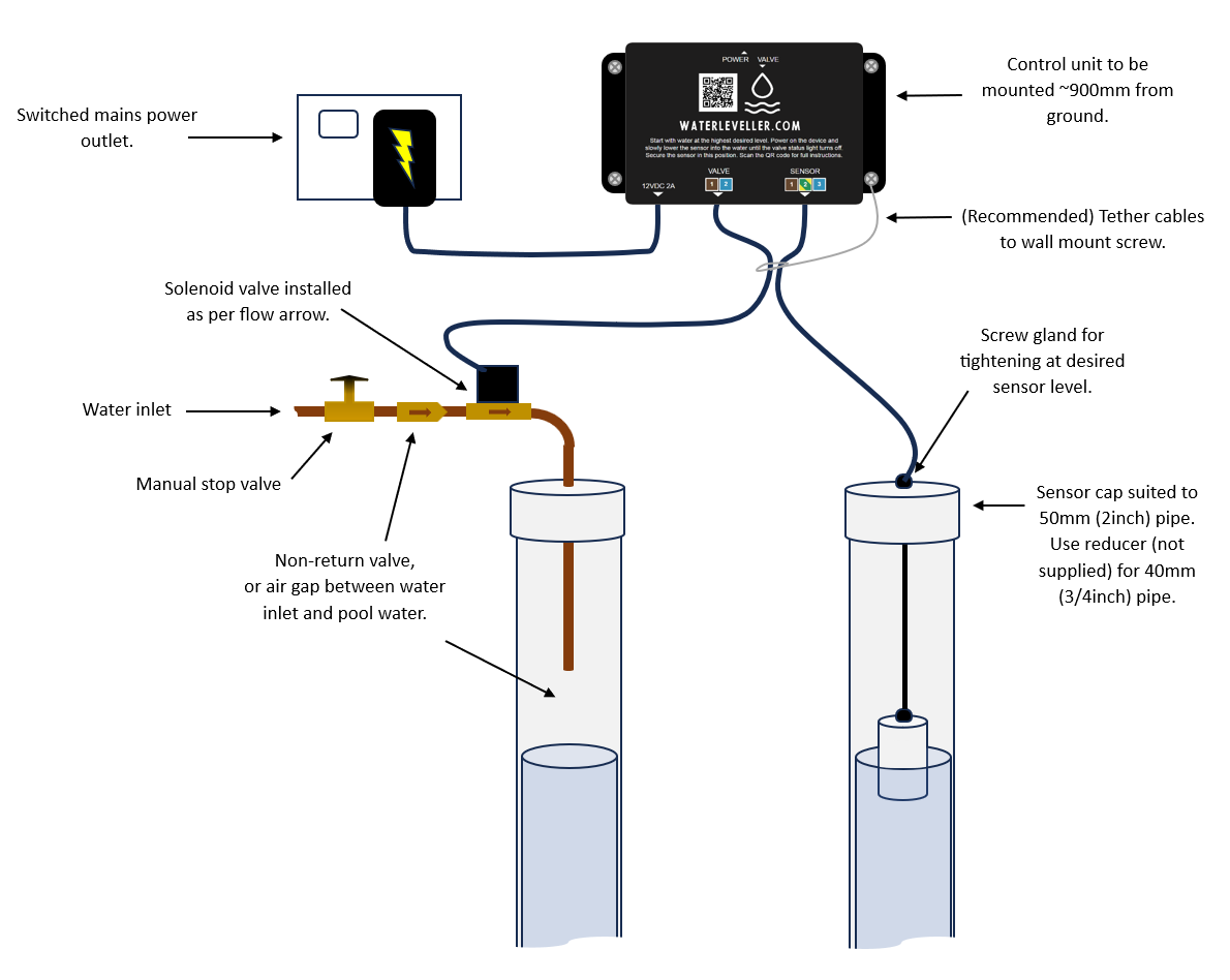 - Connect the sensor to the control unit but avoid submerging it in the water level pipe.